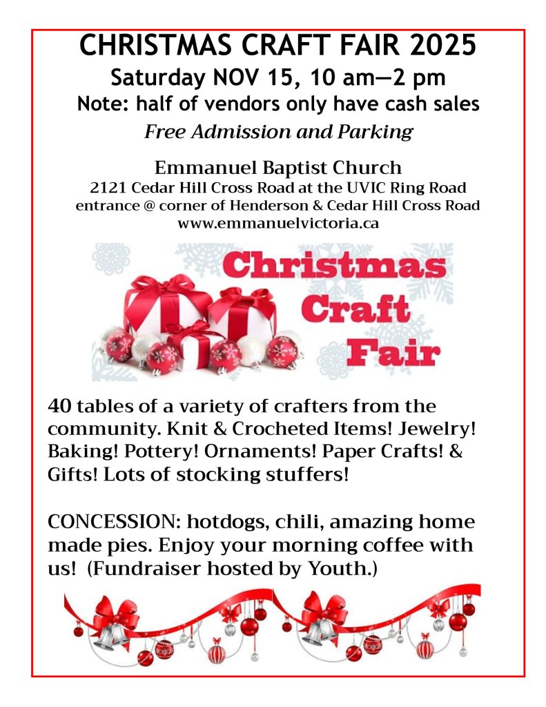 40 tables of a variety of crafters from the community. Knit & Crocheted Items! Jewelry! Baking! Pottery! Ornaments! Paper Crafts & Gifts! Lots of Stocking Stuffers! Concession serving hotdogs, chili, amazing homemade pies. Mark your calendars.